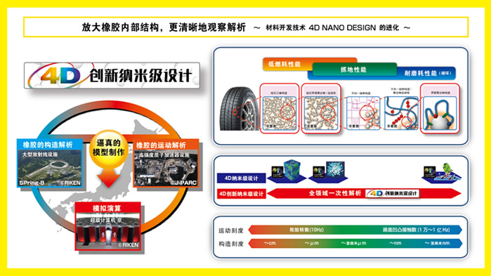 回顧?quán)嚨撈盏钠放瓢l(fā)展歷程,技術(shù)創(chuàng)新是出現(xiàn)頻率最高的關(guān)鍵詞。鄧祿普技術(shù)團(tuán)隊持續(xù)探索尖端科技,最新開發(fā)“4D創(chuàng)新納米級設(shè)計”技術(shù)運(yùn)用大型放射光設(shè)備“Spring-8”、高強(qiáng)度質(zhì)子加速器“J-PARC”和超級計算機(jī)“京”,從納米級微觀領(lǐng)域真實再現(xiàn)橡膠分子結(jié)構(gòu)及運(yùn)動形態(tài),使原材料的開發(fā)精度和效率實現(xiàn)了質(zhì)的飛躍,全面提升了輪胎產(chǎn)品的低油耗性能、抓地力性能和耐磨耗性能。